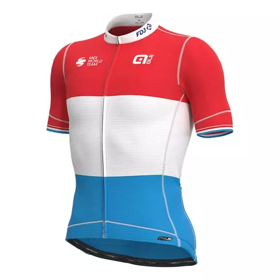 Maglia Groupama-FDJ 2022 Luxembourg Champion PR-System a manica corta realizzata in tessuto micro forato leggero nelle maniche e nel pannello anteriore. Il pannello posteriore è in tessuto Carbon Triangle con proprietà di dissipazione del calore, antistatica e antibatterica. Ha le cuciture piatte estremamente comode a contatto con la pelle e che migliorano l’aerodinamica. Con fasce STABILITY SYSTEM sulle maniche e in vita. Cerniera completa. Inserti catarifrangenti nella parte posteriore. Rango di temperatura 18-30º.