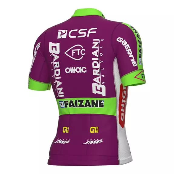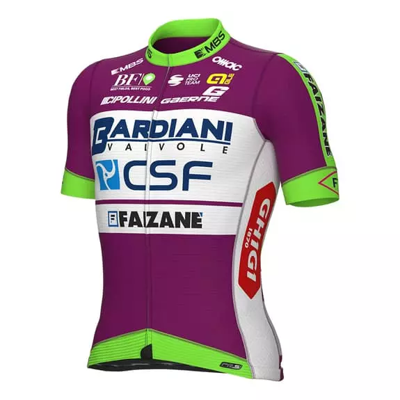 La maglia Bardiani CSF Faizanè Pro Team 2022 PR-System a manica corta è realizzata in leggero tessuto micro-traforato nelle maniche e nel pannello anteriore. Il pannello posteriore è in tessuto Carbon Triangle con proprietà di dissipazione del calore, antistatica e antibatterica. Ha le cuciture piatte estremamente comode a contatto con la pelle e che migliorano l’aerodinamica. Con fasce STABILITY SYSTEM sulle maniche e in vita. Cerniera completa. Inserti catarifrangenti nella parte posteriore. Rango di temperatura 18-30º.