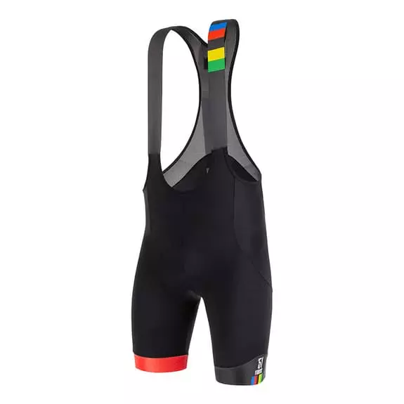 La salopette Santini UCI Varese 1951 è realizzata con tessuto a compressione Thunderbike Power con grip interno in silicone.