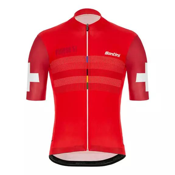 La maglia Santini UCI Varese 1951 è ispirata dalla vittoria di Ferdi Kübler ai campionati mondiali di Varese nel 1951. La maglia è dotata di una cerniera a strisce arcobaleno appositamente progettata. L’etichetta stampata cucita nella tasca posteriore racconta la vittoria di Ferdi Kübler a Varese.