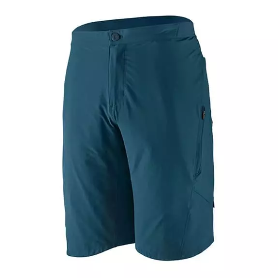 I pantaloni corti Patagonia Landfarer senza fondello presentano un sottile elastico in vita con chiusura a bottone; tessuto elastico e traspirante; la zona del cavallo più lunga della linea MTB, per una vestibilità comoda e versatile.