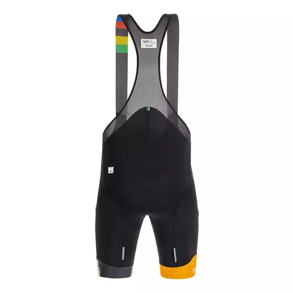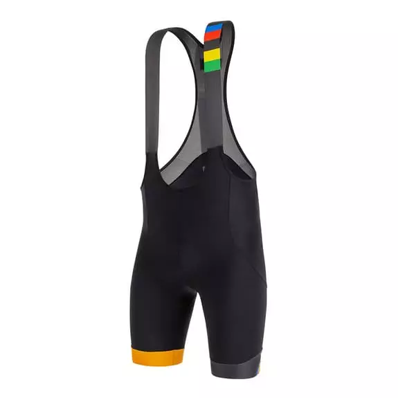 La salopette Santini UCI Sallanches 1964 è realizzata con tessuto a compressione Thunderbike Power con grip interna in silicone.