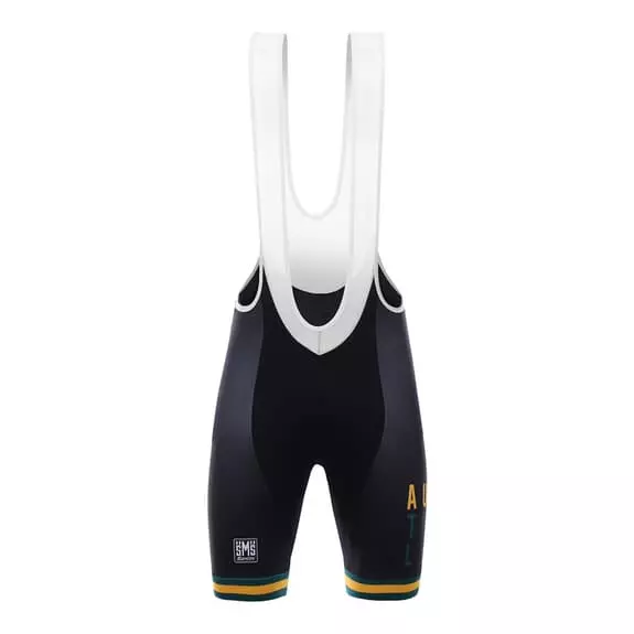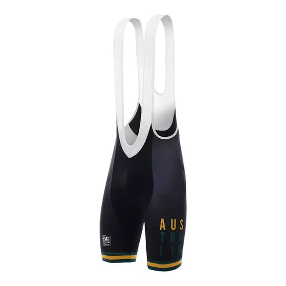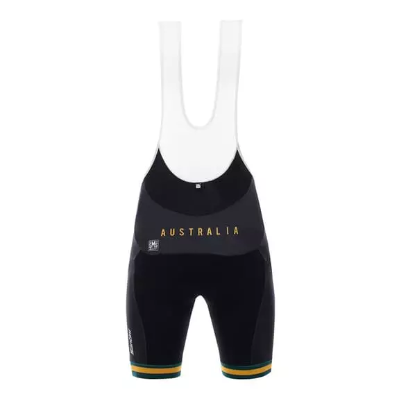 Salopette Santini Australia National Team 2017 confezionata in Lycra Newport con carbonio inserito che protegge dai raggi ultravioletti ed è termoregolatore. Disegnata con un taglio anatomico, elasticizzato e compatto per ridurre la fatica muscolare. Bretelle in rete morbida e traspirabile. Stampe riflettenti per maggiore sicurezza. Fondello MAX2.