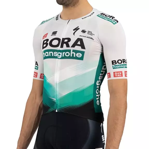 Maglia BORA-hansgrohe 2021 Bomber Pro Race confezionata in tessuto molto leggero e traspirante, 100% poliestere ad asciugatura rapida, morbido al tatto e molto elastico, adattandosi perfettamente. La parte posteriore è confezionata in tessuto AeroMesh a partire da un’unica pezza. Cerniera completa YKK.