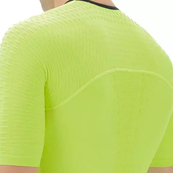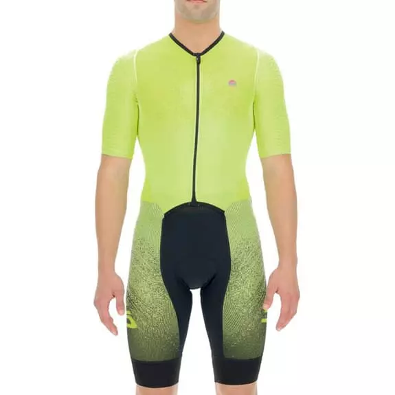 Il body integrale UYN Biking OW si basa sulla struttura e le tecnologie della salopette Racefast, la migliore della collezione. Invece delle bretelle, è stata integrata una parte superiore molto leggera con cerniera frontale divisibile. Questo sistema consente di indossare il body in modo rapido e confortevole e di utilizzarlo in qualsiasi tipo di uscita invece di indossare il kit maglia e pantaloncini. La versatilità è resa possibile anche dalla presenza di due tasche posteriori per trasportare il cellulare, le barrette energetiche e altri piccoli oggetti. La zona delle spalle è realizzata con la tecnologia tridimensionale Haloflex con una doppia funzione: minore resistenza all’aria sulla superficie esterna, maggiore ventilazione tra la pelle e il tessuto. Nella zona della schiena, la struttura Coolvent assorbe il sudore e lo trasporta verso l’esterno, contribuendo a creare un clima corporeo ideale.