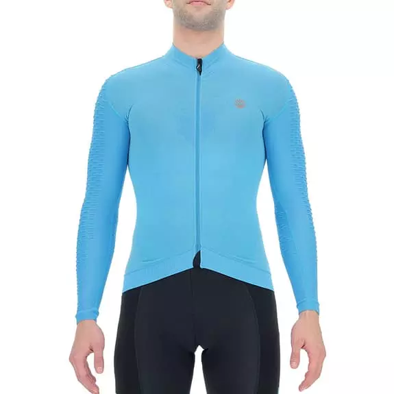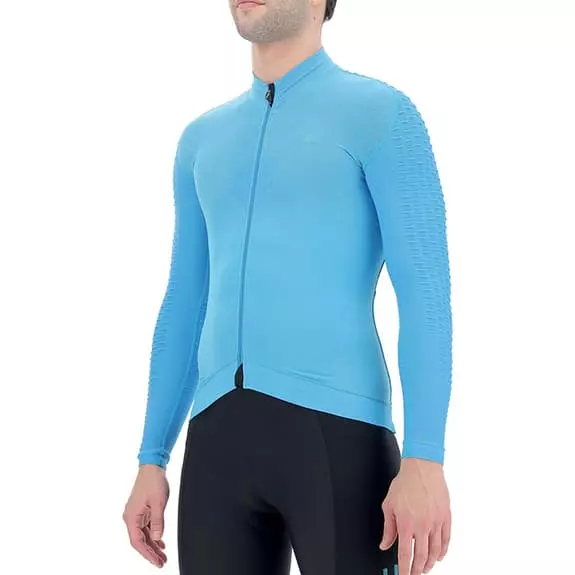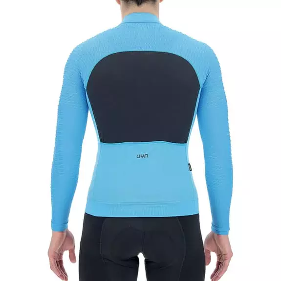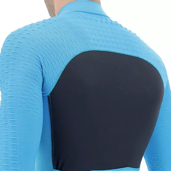 La maglia UYN Airwing a manica lunga è progettata per le uscite invernali. Le spalle e le maniche incorporano la tecnologia Haloflex, con una struttura tridimensionale che aumenta la capacità elastica del tessuto. Questa tecnologia genera un effetto aerodinamico sulla superficie esterna, mentre la superficie a contatto con la pelle crea cellule climatiche che intrappolano l’aria e formano uno strato isolante. Il tessuto è intrecciato a diversi livelli di spessore per creare zone altamente traspiranti sul petto e sotto le ascelle, mentre i microfori sulla schiena favoriscono lo scambio d’aria con l’esterno. È realizzato con l’esclusiva biofibra Natex, che si asciuga il 50% più velocemente del nylon tradizionale. Il design ergonomico permette alla maglia di adattarsi perfettamente al corpo per una migliore aerodinamica.